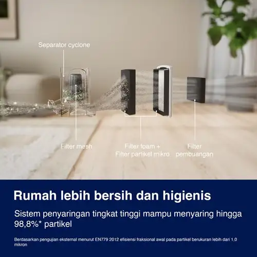 • Dengan separator cyclone, aktivitas bersih-bersih bisa dilakukan lebih lama tanpa interupsi