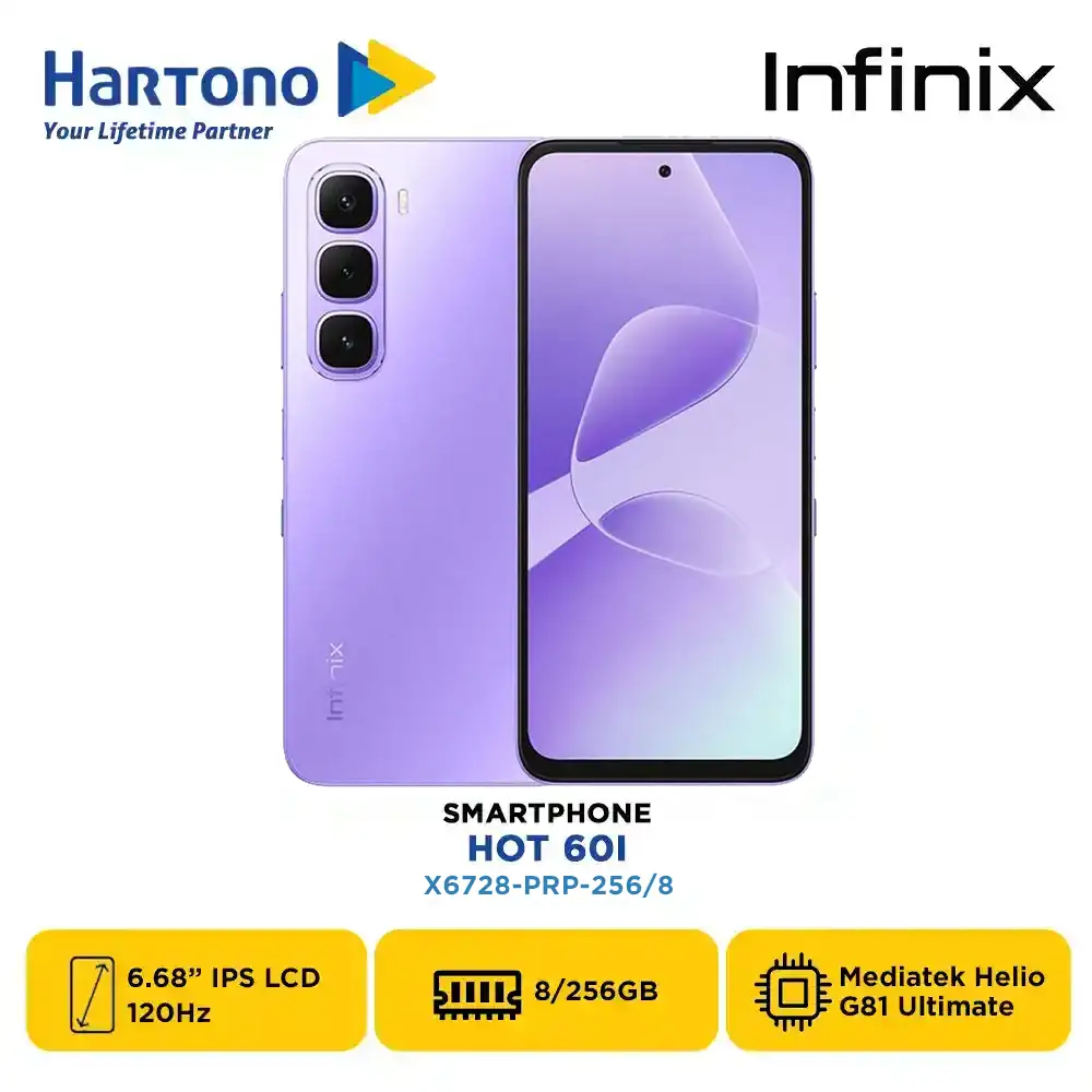 Infinix Hot 60i Series, membawa teknologi mutakhir langsung ke genggaman Anda. Smartphone ini hadir dalam beberapa varian warna dan memori: Black 8/256GB (X6728-BLK-256/8), Blue 8/256GB (X6728-BLU-256/8), Silver 8/256GB (X6728-SLV-256/8), Purple 8/256GB (X6728-PRP-256/8).