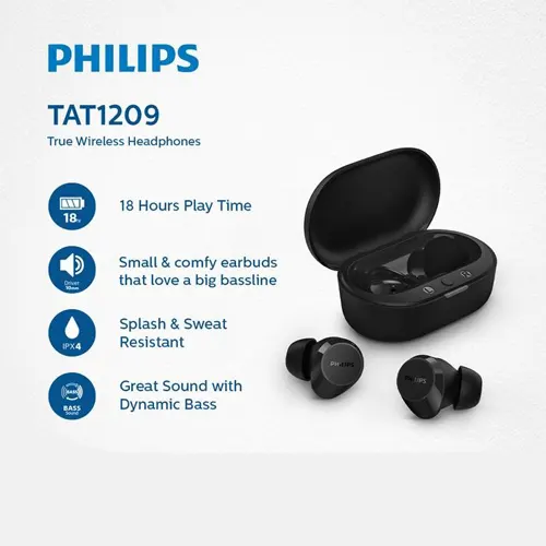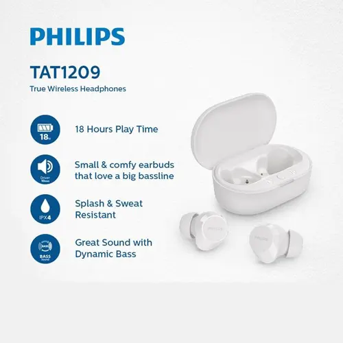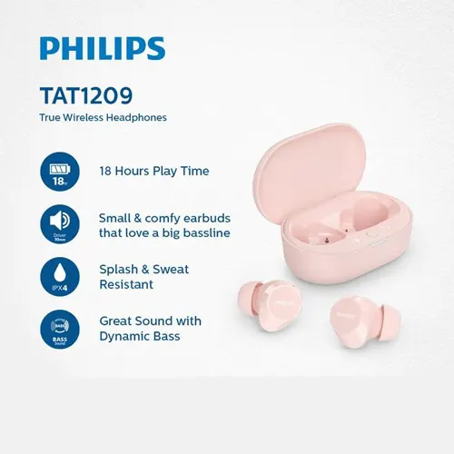 Philips TAT1209 adalah earbud true-wireless kecil yang nyaman dan sangat praktis untuk penggunaan harian. Meskipun memiliki ukuran compact, earbud ini menawarkan suara hangat, natural, serta bass dinamis yang bisa diaktifkan melalui sentuhan (tap) di bagian earbud. Ditambah lagi, casing pengisi daya berukuran saku sangat mudah dibawa ke mana-mana. Memiliki varian warna Hitam (PHILIPSTAT1209BK), Merah Muda (PHILIPSTAT1209PK), Putih (PHILIPSTAT1209WT).