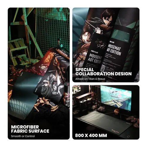 • Rexus x Attack on Titan Mousemat Series hadir untuk melengkapi setup gaming Anda dengan desain ikonik yang memadukan kualitas premium dan tampilan khas Attack on Titan.