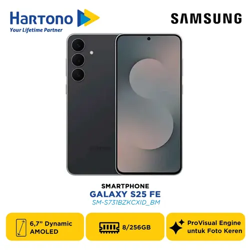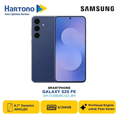 Samsung Galaxy S25 FE Series, membawa teknologi mutakhir langsung ke genggaman Anda. Smartphone ini hadir dalam beberapa varian warna dan memori: Navy 8/128GB (SM-S731BDBBXID), Icy Blue 8/128GB (SM-S731BLBBXID), Black 8/128GB (SM-S731BZKBXID), White 8/128GB (SM-S731BZWBXID), Navy 8/256GB (SM-S731BDBCXID), Icy Blue 8/256GB (SM-S731BLBCXID), Black 8/256GB (SM-S731BZKCXID), White 8/256GB (SM-S731BZWCXID).