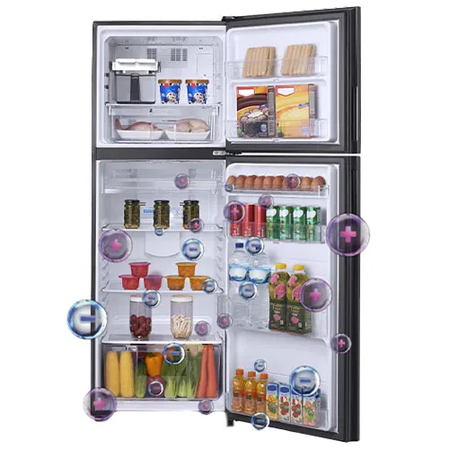• 24H/7 Always ON Plasmacluster : sistem Plasmacluster yang aktif terus menerus untuk menjaga kebersihan udara di dalam kulkas.