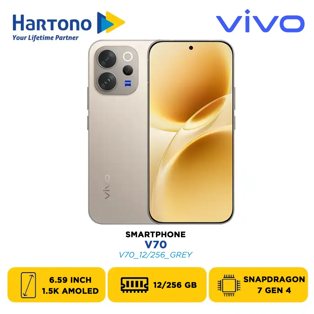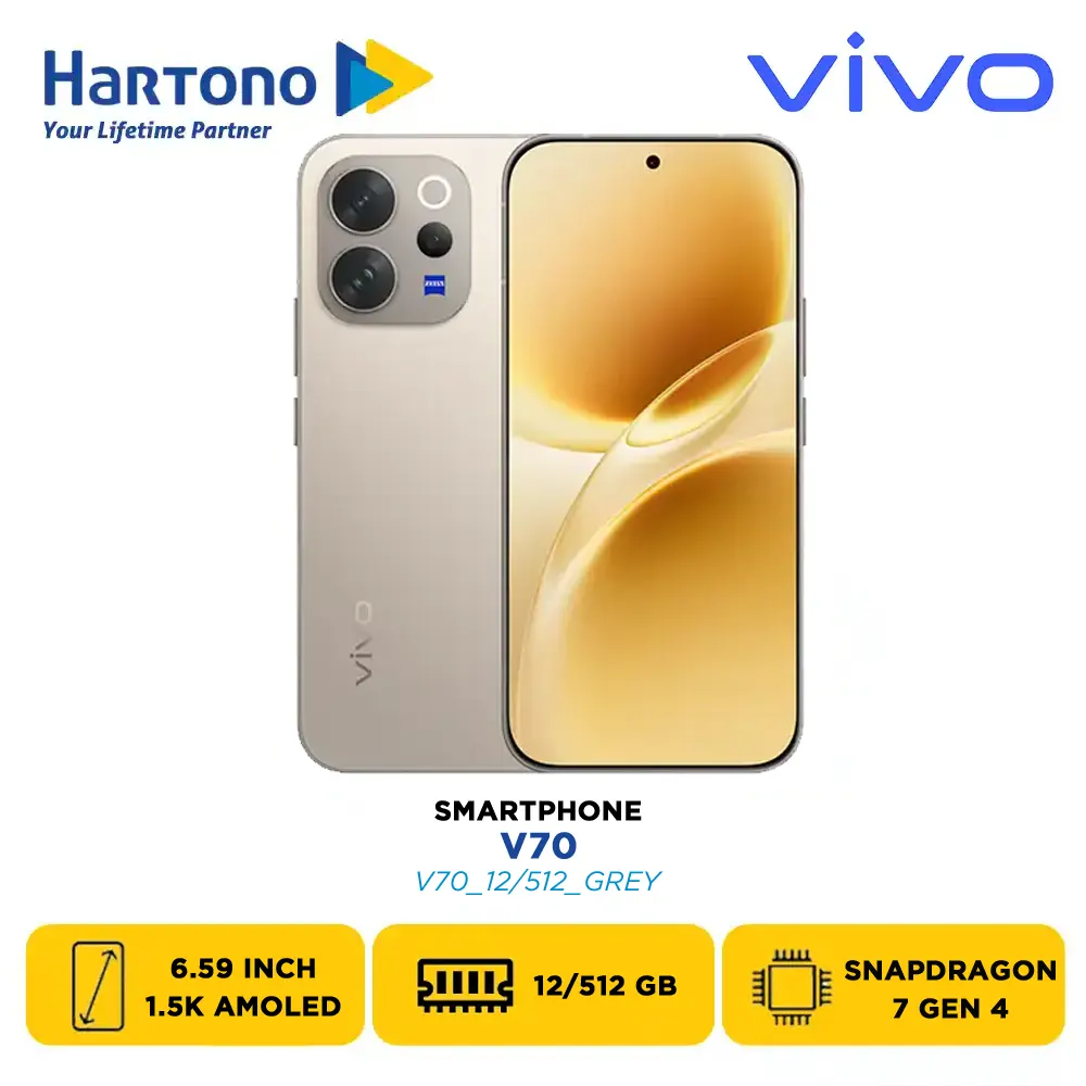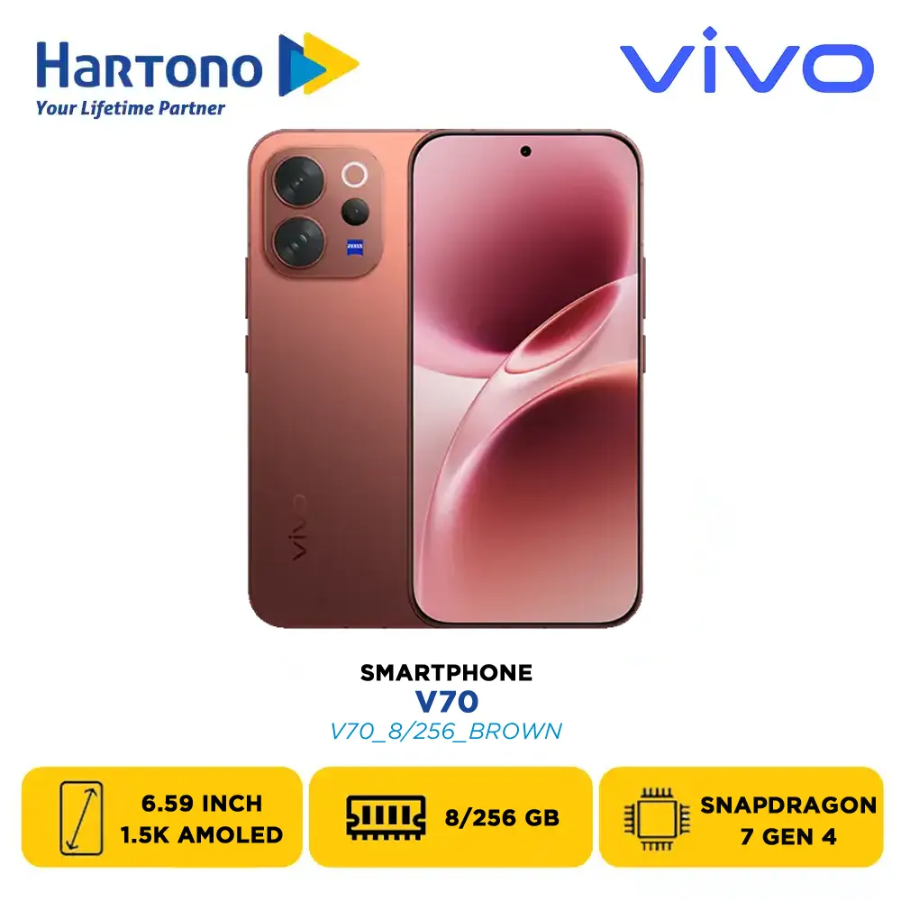 Vivo V70, membawa teknologi mutakhir langsung ke genggaman Anda. Smartphone ini hadir dalam beberapa varian warna dan memori: Sandalwood Brown 8/256GB (V70_8/256_BROWN), Alpine Gray 8/256GB (V70_8/256_GREY), Golden Hour 8/256GB (V70_8/256_GOLD), Sandalwood Brown 12/256GB (V70_12/256_BROWN), Alpine Gray 12/256GB (V70_12/256_GREY), Golden Hour 12/256GB (V70_12/256_GOLD), Sandalwood Brown 12/512GB (V70_12/512_BROWN), Alpine Gray 12/512GB (V70_12/512_GREY), Golden Hour 12/512GB (V70_12/512_GOLD).
